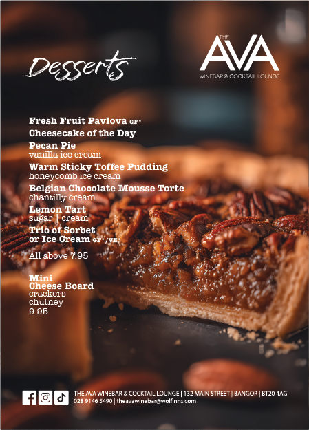 The Ava Complex is situated at the gateway of Bangor City. Comprising of Public bar, Winebar and Cocktail Lounge everyone is catered for. Boasting some of the finest seasonal fayre and fabulous cocktails, our professional team will make your visit enjoyable and memorable.